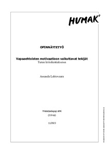(2023)Vapaaehtoisilla on merkittävä rooli järjestötyössä. Tämän opinnäytetyön tilaajana toimi Turun kriisikeskus. Tämän opinnäytetyön tarkoituksena oli kerätä tietoa vapaaehtoisten motivaatioon vaikuttavista tekijöistä, sekä ... -