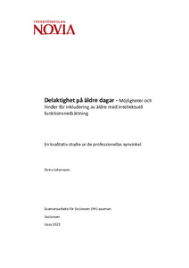 (2025)Detta examensarbete handlar om ensamhet och social isolering bland äldre personer med intellektuell funktionsnedsättning och fokuserar på hur professionella inom boendeservice främjar delaktighet och umgänge. Problemet ... -