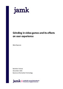 (2025)Aiheesta grindaaminen - toistuva työ videopeleissä ja sen vaikutuksista käyttökokemukseen on tutkittu akateemisesti vähän. Tutkimuksen kohdealueeksi valittiin yksi videopeli, Helldivers 2. Sen pelattavuuden toistuva kierre ... -