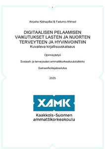 (2025)Tämän opinnäytetyön tarkoituksena oli koota tietoa lasten ja nuorten digitaalisen pelaamisen vaikutuksista terveyteen ja hyvinvointiin kirjallisuuskatsausta hyödyntäen. Tavoitteena oli tuottaa ajankohtaista tietoa, jota ... -
