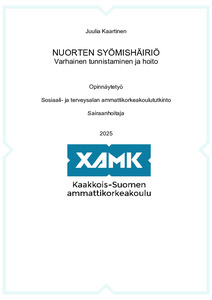 (2025)Syömishäiriö on yksi yleisimmistä pitkäaikaisista mielenterveydenhäiriöistä. Nuorilla syömishäiriö kehittyy herkemmin kuin aikuisilla. Syömishäiriön kaut-ta yksilö pyrkii kontrolloimaan jotain toista elämässä olevaa vaihetta ... -