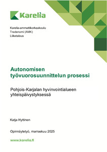 (2025)Opinnäytetyössä toteutettiin konkreettisesti siirtyminen esihenkilön toteuttamasta työvuorosuunnittelusta autonomiseen työvuorosuunnitteluun. Muutos toteutettiin Pohjois-Karjalan hyvinvointialueen yhteispäivystyksessä. ... -