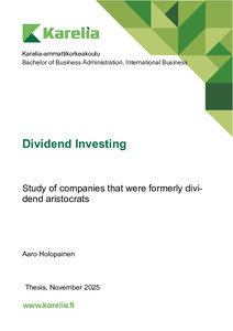 (2025)The purpose of this thesis is to provide an overview of dividends as an investment target. The thesis also presents a unique group of dividend aristocrats that have been able to increase their dividends year after year. ... -