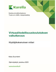 (2025)Tässä toiminnallisessa opinnäytetyössä tuotettiin 3D Talo Finland Oy:n vaikuttavuusmittaristoon loppukäyttäjäsegmentille kohdennettu käyttäjäkokemuksen mittari. Työssä tarkasteltiin virtuaalitodellisuuskoulutuksen ... -