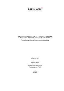 (2025)Opinnäytetyöni tavoitteena oli lisätä Lapin ammattikorkeakoulun monimuotoopiskelijoiden tietoisuutta toistuvan pitkäkestoisen istumisen aiheuttamista terveyshaitoista sekä istumisen tauottamisen keinoista ja hyödyistä. ... -