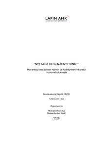 (2026)Opinnäytetyössä tarkasteltiin hoivarobotin käyttöä ikääntyneiden hoivakodissa. Työ toteutettiin osana RoboSoteLab –hanketta, jonka tavoitteena on edistää robotiikan ja älyteknologian käyttöönottoa sosiaali- ja terveydenhuollossa ... -