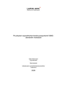 (2026)Opinnäytetyön aiheena oli pk-yritysten vapaaehtoisen kestävyysraportoinnin toteuttaminen VSME-standardin mukaisesti. Opinnäytetyön tavoitteena oli kuvata, miten VSME-standardin mukainen kestävyysraportti laaditaan käytännössä ... -