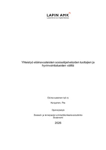(2026)Opinnäytetyö kartoitti yhteistyötä eläinavusteisten sosiaalipalveluiden tuottajien ja hyvinvointialueiden välillä. Opinnäytetyön toimeksiantajana toimi Eläinavusteinen työ ry. Tutkimuksessa tarkasteltiin yhteistyön sujuvuutta ... -