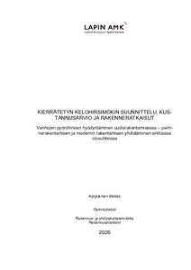 (2026)Opinnäytetyössä suunniteltiin Utsjoelle rakennettava kierrätetyistä kelohirsistä rakennettava hirsimökki sekä laadittiin hankkeelle kustannusarvio ja rakenneratkaisut. Työn tavoitteena oli tuottaa toimeksiantajalle ... -
