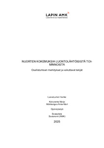 (2025)Opinnäytetyömme tavoitteena oli selvittää LuovaLumot-hankkeeseen osallistuneiden nuorten kokemuksia luontolähtöisestä toiminnasta sekä tunnistaa osallistumista edistäviä ja estäviä tekijöitä. Lisäksi pyrittiin löytämään ... -