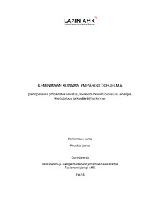 (2025)Tässä opinnäytetyössä laadittiin toimeksiantajalle, Keminmaan kunnalle ympäristöohjelma, jonka keskeiset teemat olivat ympäristökasvatus, luonnon monimuotoisuus, uusiutuva energia ja energiatehokkuus, kiertotalous sekä ... -