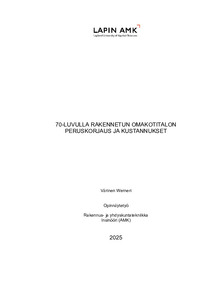 (2026)Opinnäytetyön tavoitteena oli tehdä vuonna 1975 rakennettuun omakotitaloon kuntoarvio, korjaussuunnitelma ja laskea kustannuksia. Työssä pohdin, miten rakennus saataisiin korjattua. Kuntoarviota tehtiin kohteeseen ... -