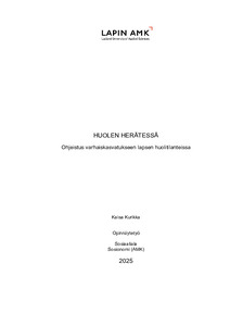 (2025)Tämän opinnäytetyön tavoitteena on saada varmuutta varhaiskasvatuksen henkilökunnalle reagoida lapsen huolitilanteeseen. Opinnäytetyön tuotoksena syntyy selkeä ja helposti luettava ohjeistus lapsen huolitilanteista ... -