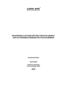 (2025)Tämän opinnäytetyön tarkoituksena oli tutkia onko Neurosonic-laitteen käytöllä vaikutusta urheilijan autonomisen hermoston palautumiseen. Tutkimus suoritettiin niissä olosuhteissa, jossa Neurosonicia Lapin Urheiluopistolla ... -