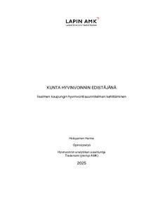(2025)Opinnäytetyön tarkoituksena oli kehittää Iisalmen kaupungin hyvinvointitiedolla johtamista. Opinnäytetyön tavoitteena oli tuottaa visuaalinen hyvinvointisuunnitelma valtuustokaudelle 2025–2029. Kehittämistyön tavoitteena ... -