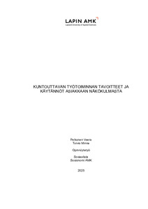(2025)Tämän opinnäytetyön tarkoituksena ja tavoitteena oli selvittää kuntouttavan työtoiminnan lähtökohtia, tavoitteita ja sitä miten tavoitteita kohti edetään käytännön työssä asiakkaan näkökulmasta. Pohdimme mitkä ovat ne syyt, ... -