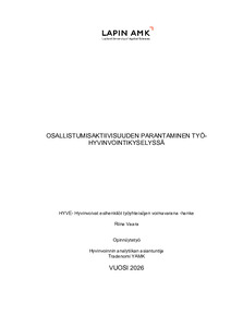 (2026)Tämän opinnäytetyön aiheena oli työntekijöiden osallistumisaktiivisuus työhyvinvointikyselyissä. Tarkoituksena oli selvittää, mitkä tekijät vaikuttavat henkilöstön vastausaktiivisuuteen ja millä keinoilla osallistumista ...