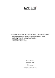 (2025)Tämän opinnäytetyön aiheena on hoitohenkilöstön kokemuksia toipumisorientaation ja yhteisöhoitomallin käytöstä mielenterveyskuntoutujien asumisyksikössä. Opinnäytetyön tarkoituksena oli selvittää erään mielenterveyskuntoutujien ... -