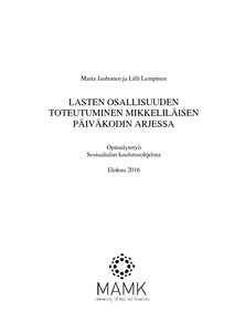(Mikkelin ammattikorkeakoulu, 2016)Tämän opinnäytetyön tarkoituksena oli selvittää lasten osallisuuden toteutumista päiväkodin arjessa ja sen perustoiminnoissa. Tarkoituksena oli myös selvittää, kohtaavatko lasten ja aikuisten näkemykset osallisuuden ... -