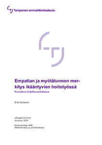 (2026)Tämän opinnäytetyön tarkoituksena oli kuvata, miten empatia ja myötätunto ilmenevät ikääntyvien hoitotyössä sekä millaiset tekijät vaikuttavat niiden toteutumiseen. Työ toteutettiin kuvailevana kirjallisuuskatsauksena, ja ... -