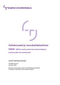 (2025)Opinnäytetyössä selvitettiin neurokehityksellisen häiriön naisten kokemuksia vaihdevuosista. Opinnäytetyö toteutettiin laadullisena kyselytutkimuksena ADHD-liitolle. Työn avulla tavoiteltiin syvällistä näkemystä, miten ...
