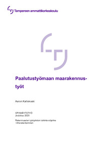 (2025)Opinnäytetyön aiheena oli maanrakennustyöt paalujen keskellä. Tässä opinnäytetyössä käsitellään työvaiheita, jotka pitää suorittaa ennen ja jälkeen paalutuksen. Työn toimeksiantajana toimi Tieluiska Oy Opinnäytetyön ... -