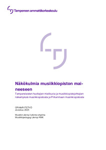(2025)Opinnäytetyössä tarkasteltiin musiikkiopiston ja tapauskohtaisesti Pirkanmaan musiikkiopiston mainetta kahdesta näkökulmasta: tamperelaisten huoltajien mielikuvien sekä musiikkiopistojohtajien näkemysten kautta. Huoltajilta ... -