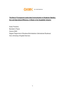 (2025)Overall, it can be concluded that transparent leadership communication is a powerful tool. It is not an administrative job, but rather a strategic job that engenders a virtuous circle. Clarity from leaders creates trust, ...Avoin saatavuus / Open access / Öppen tillgång -