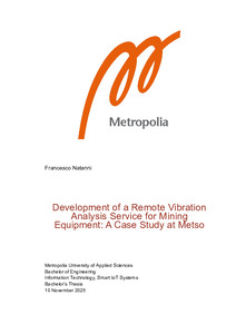 (2025)This thesis presents the development of a remote vibration monitoring service for mining equipment, conducted as a case study at Metso. The project addresses the limitations of traditional on-site vibration analysis — such ... -