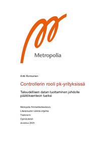 (2026)Tämän tutkimustyyppisen opinnäytetyön tarkoituksena oli syventää ymmärrystä controllerin roolista pk-yrityksissä ja siitä, minkälaista dataa controller tuottaa pk-yrityksen johdolle päätöksenteon tueksi. Opinnäytetyöhön ... -