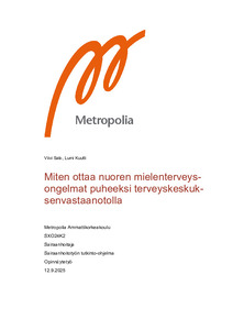 (2025)Tämän toiminnallisen opinnäytetyön tuotoksena kehitettiin käytännönläheinen opas nuorten mielenterveysasioiden puheeksiottamisesta terveyskeskuksen vastaanotolla. Oppaan tarkoituksena on tukea terveydenhuollon ammattilaisia ... -