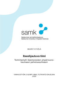 (2025)Opinnäytetyön tarkoituksena oli kehittää ja pilotoida itseohjautuvan tiimin toimintamalli Ruskatalojen palveluyhdistys ry:n yhdessä yksikössä. Tavoitteena oli kehittää tiimin toimivuutta organisaatiossa itseohjautuvuuden ... -