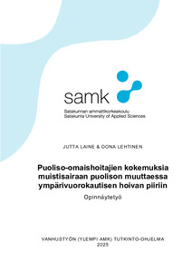(2025)Tämän opinnäytetyön tarkoituksena oli kuvata puoliso-omaishoitajien kokemuksia hoitovastuusta luopumisesta muistisairaan puolison muuttaessa ympärivuorokautisen hoivan yksikköön. Tavoitteena oli tuottaa tietoa siitä, miten ... -