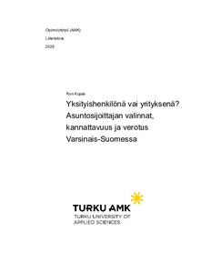 (2025)Tämän opinnäytetyön tavoitteena oli arvioida ja tutkia asuntosijoittamisen kannattavuutta ja riskejä vertaamalla sijoittamista yksityishenkilönä ja osakeyhtiön kautta käytännön esimerkin avulla. Opinnäytetyö keskittyi omaan ... -