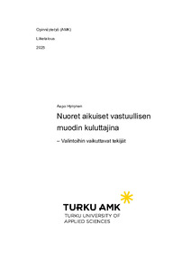(2025)Työn tavoitteena oli kuvata, miten vastuullisuus näkyy nuorten aikuisten vaatehankinnoissa ja mitkä tekijät tukevat tai estävät vastuullisempia valintoja. Taustaksi tarkasteltiin arvo–toiminta-kuilua ja tiedon roolia ... -