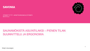 (2025)Tämän opinnäytetyön tavoitteena oli suunnitella saunamökin laajennus kokonaan asuinkäyttöön soveltuvaksi tilaksi. Työssä tarkasteltiin erityisesti pienten tilojen suunnitteluun liittyviä haasteita ja mahdollisuuksia sekä ... -