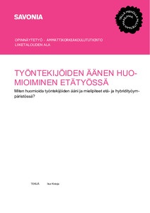 (2025)Tämä opinnäytetyö tarkastelee työntekijöiden äänen huomioimista etä- ja hybridityössä, sekä siihen vaikuttavia tekijöitä, kuten esihenkilötyötä ja psykologista turvallisuutta. Etätyön yleistyminen koronapandemian jälkeen ... -