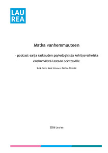 (2026)Tämän toiminnallisen opinnäytetyön tarkoituksena oli tuottaa laadukas kolmen jakson podcast-sarja raskauden psykologisista kehitysvaiheista, vanhemmuuden kehittymisestä ja sitä vahvistavista keinoista. Työelämäkumppanina ...Avoin saatavuus / Open access / Öppen tillgång -