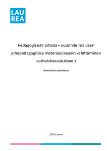 (2026)Tämän opinnäytetyön tavoitteena oli kehittää materiaalikassi päiväkodin pihapedagogiikan tueksi ja testata sen toimivuutta käytännössä. Materiaalikassin suunnittelu toteutettiin yhteiskehittämisen menetelmällä, jossa ...Avoin saatavuus / Open access / Öppen tillgång -