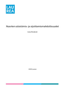 (2025)Tämän opinnäytetyön tavoitteena oli tutkia nuorten aikuisten (18–25 v) säästämisen ja sijoittamisen mahdollisuuksia nykyisessä taloustilanteessa. Työn tarkoituksena oli selvittää mitkä tekijät vaikuttavat nuorten säästämisen ...Avoin saatavuus / Open access / Öppen tillgång -