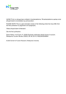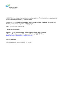 (Haaga-Helia ammattikorkeakoulu, 2024)Veto- ja pitovoimaa -hankkeen tavoite on tukea ja kehittää työntekijäymmärrystä matkailu-, ravintola- ja majoitusalalla. Työvoiman saatavuushaasteiden myötä työntekijä-kokemuksen merkitys yritysten kilpailukykytekijänä on ... -