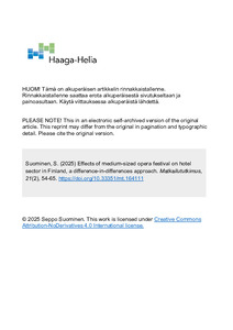 Matkailututkimus : 2 (Suomen matkailututkimuksen seura, 2025)The research question is to study the effects of an opera festival on the hotel industry in a small city, Savonlinna, in Finland. The Savonlinna opera festival takes place every summer except when the COVID-19 pandemic led ... -