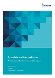 (2025)Tämän opinnäytetyön tavoitteena on tarkastella poliisiorganisaation johtamista ryhmädynamiikan ja erilaisten johtamismallien näkökulmista. Tutkimuksessa selvitetään, millä keinoin ryhmänjohtaja voi vaikuttaa ryhmädynamiikan ... -