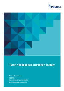 (2026)Tämän opinnäytetyön tarkoituksena on Turun venepoliisin toiminnan esittely. Tutkimuksen tavoitteena on hahmottaa Turun venepoliisin toiminnan kokonaisuus ja löytää kehitysehdotuksia toimintaan liittyen. Opinnäytetyössä ... -
