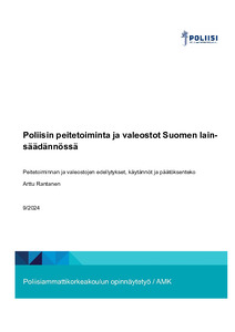 (2024)Tämä opinnäytetyö käsittelee poliisin peitetoimintaa ja valeostoa Suomen lainsäädännössä, keskittyen niiden oikeudellisiin edellytyksiin, päätöksentekoon ja näihin liittyviin käytäntöihin. Opinnäytetyön tar-koituksena on ... -