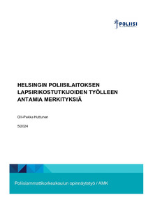 (2024)Opinnäytetyön tarkoitus on kuvata lapsirikostutkintatyötä Helsingin poliisilaitoksella. Tutkimuskysymysten avulla selvitetään, millaista lapsirikostutkinta on ja millaisia merkityksiä tutkijat antavat työlleen. Tavoitteena ... -
