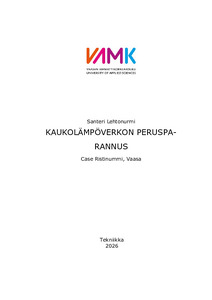(2026)Tämä opinnäytetyö käsittelee Vaasan Ristinummin kaupunginosan kaukolämpöverkon teknisen kunnon selvittämistä ja alueen kaukolämpöverkon perusparannustarpeen arviointia. Alueella on esiintynyt vesivuotoja kaukolämpöverkossa, ... -