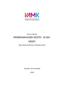 (2025)Opinnäytetyön tavoitteena on tuottaa kattava ja selkolukuinen opas Attendo Milkan henkilökunnan käyttöön. Tarkoituksena on lisätä tietoisuutta painehaavojen hoidosta ja ehkäistä painehaavojen syntymistä. Opinnäytetyö ... -