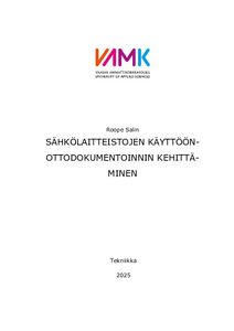 (2025)Opinnäytetyön taustalla on tarve kehittää sähköalan käyttöönoton dokumentointikäytäntöjä ja dokumentteja yrityksessä, joka toimii teollisuuden, uusiutuvan energian ja sähköasemien parissa. Erityisesti dokumentoinnin ... -