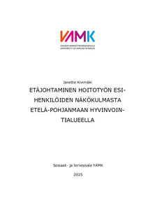 (2025)Tämän tutkimuksen tarkoituksena on tutkia sitä, miten etäjohtaminen koetaan hoitotyön esihenkilöiden näkökulmasta. Tarkoituksena on löytää keinoja siihen, miten etäjohtamista voitaisiin jatkossa edelleen kehittää. ... -